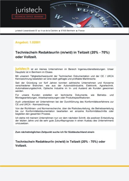 Aber nicht nur die Projektbearbeitung benötigt Verstärkung. Unsere zusätzlichen Dienstleistungen "Normenservice" und "CE / UKCA Bevollmächtigter" müssen bekannter werden und beim Kunden ankommen. Diese Bereiche sind das zweite Standbein von juristech.